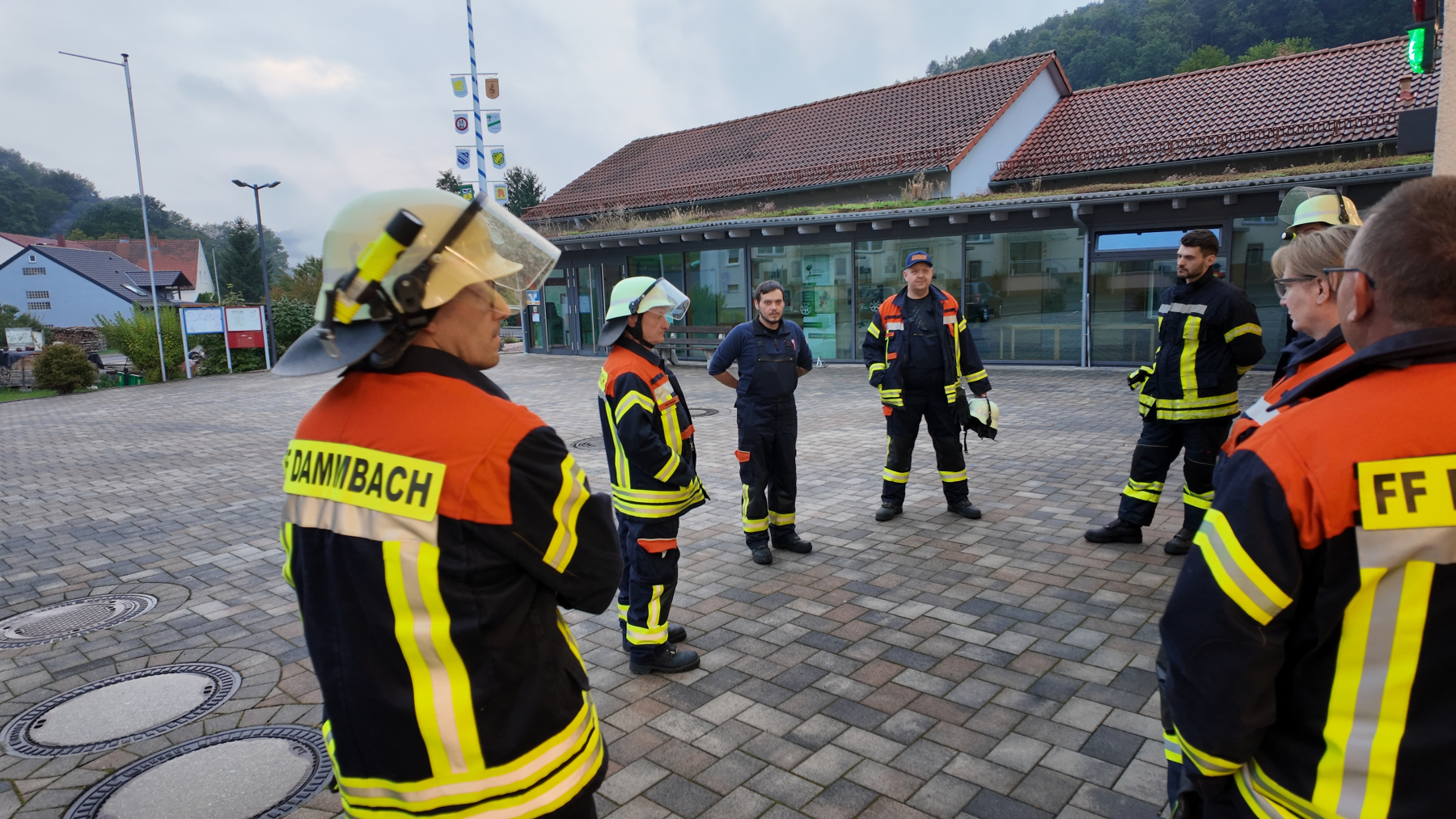 Nach der Begrüßung durch unseren Kommandanten Benjamin fuhren wir zum Gemeindebauhof. Dort wurde eine vermisste Person angenommen. Bei der Übung wurde nach der ersten Erkundung der Angriffstrupp zur Personensuche ins Gebäude geschickt. Gleichzeitig wurde im Außenbereich eine Wasserversorgung aufgebaut.
