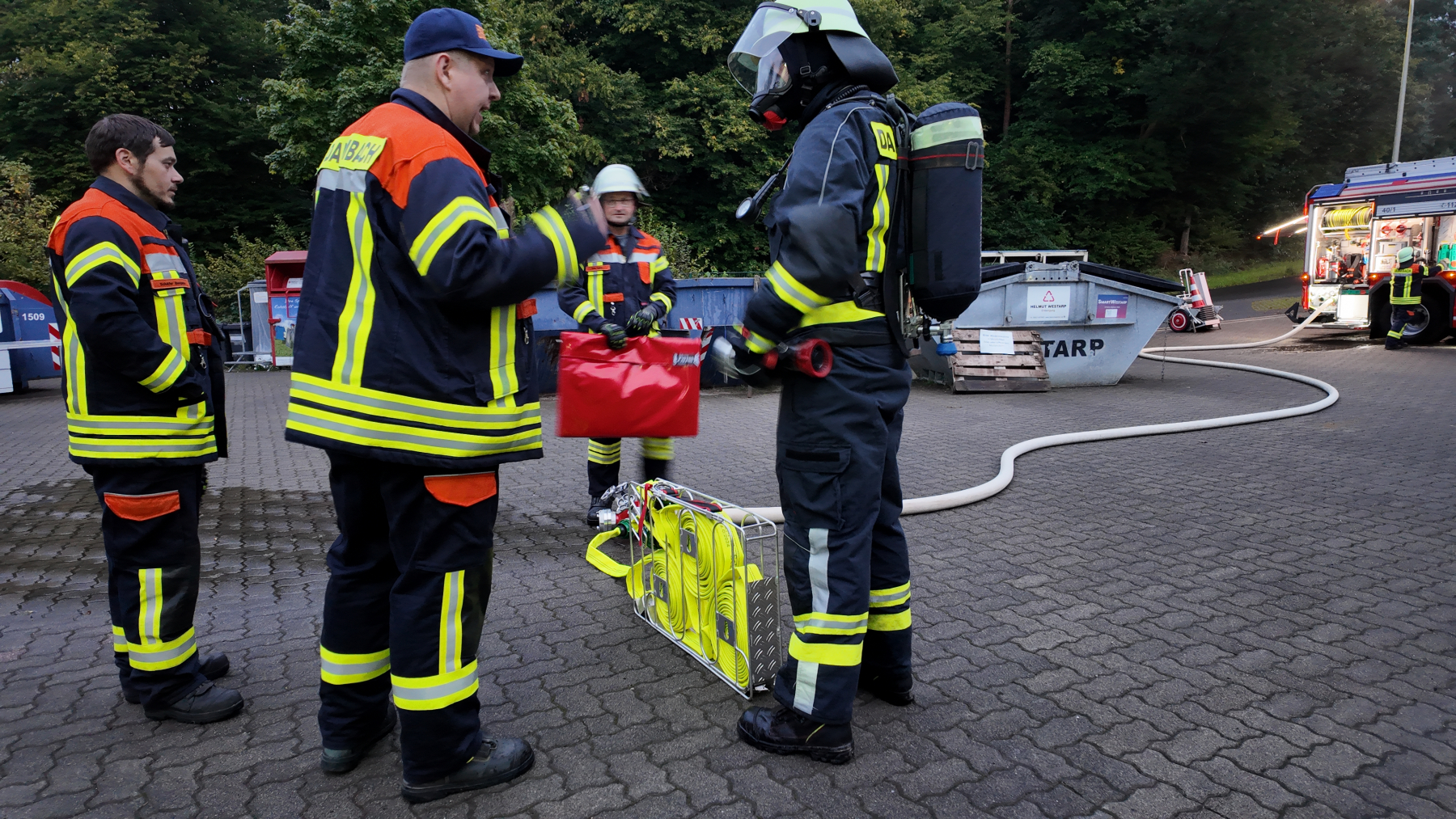 Nach der Begrüßung durch unseren Kommandanten Benjamin fuhren wir zum Gemeindebauhof. Dort wurde eine vermisste Person angenommen. Bei der Übung wurde nach der ersten Erkundung der Angriffstrupp zur Personensuche ins Gebäude geschickt. Gleichzeitig wurde im Außenbereich eine Wasserversorgung aufgebaut.