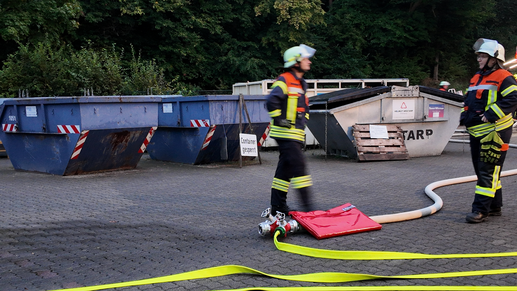 Nach der Begrüßung durch unseren Kommandanten Benjamin fuhren wir zum Gemeindebauhof. Dort wurde eine vermisste Person angenommen. Bei der Übung wurde nach der ersten Erkundung der Angriffstrupp zur Personensuche ins Gebäude geschickt. Gleichzeitig wurde im Außenbereich eine Wasserversorgung aufgebaut.