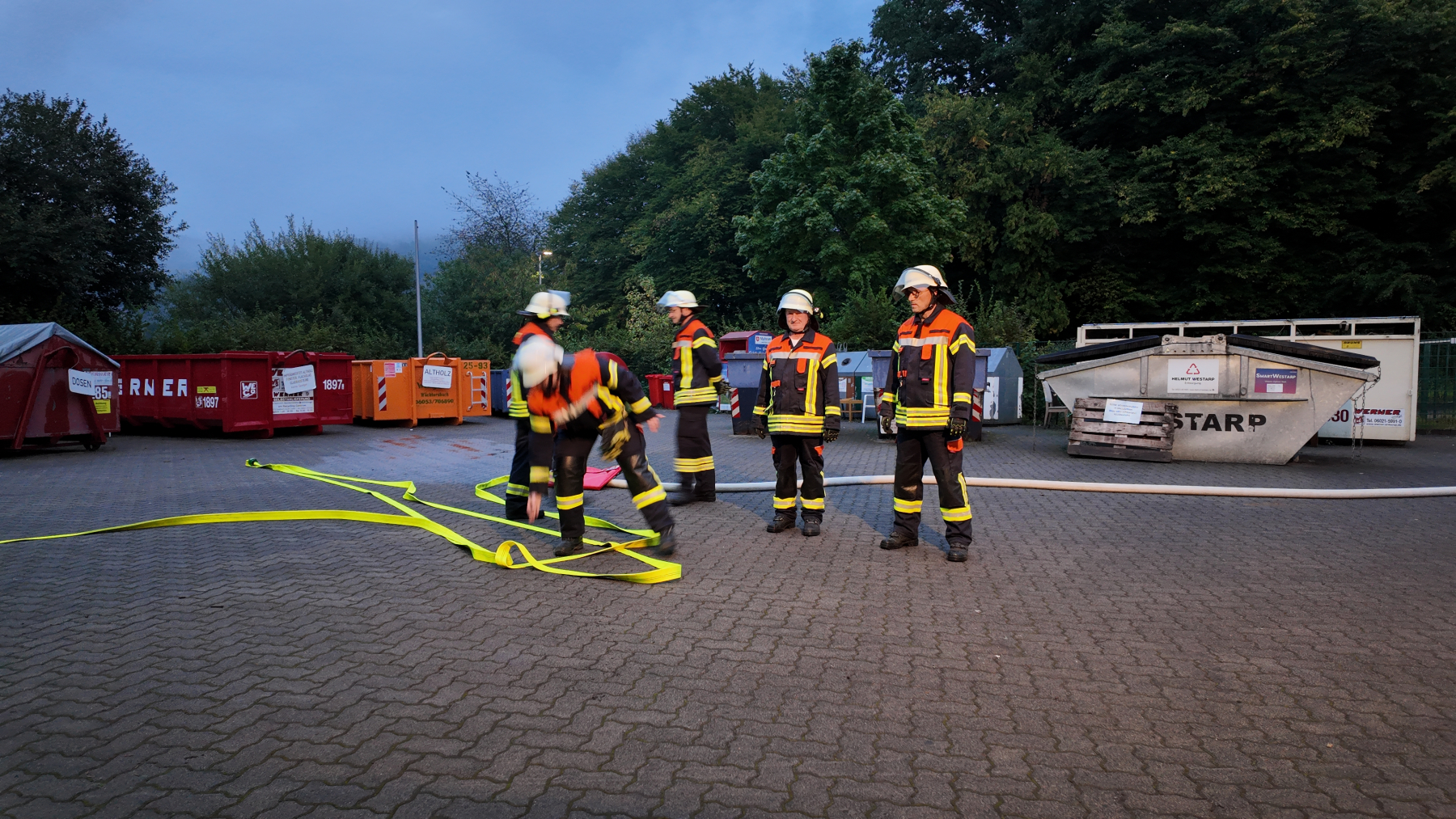Nach der Begrüßung durch unseren Kommandanten Benjamin fuhren wir zum Gemeindebauhof. Dort wurde eine vermisste Person angenommen. Bei der Übung wurde nach der ersten Erkundung der Angriffstrupp zur Personensuche ins Gebäude geschickt. Gleichzeitig wurde im Außenbereich eine Wasserversorgung aufgebaut.