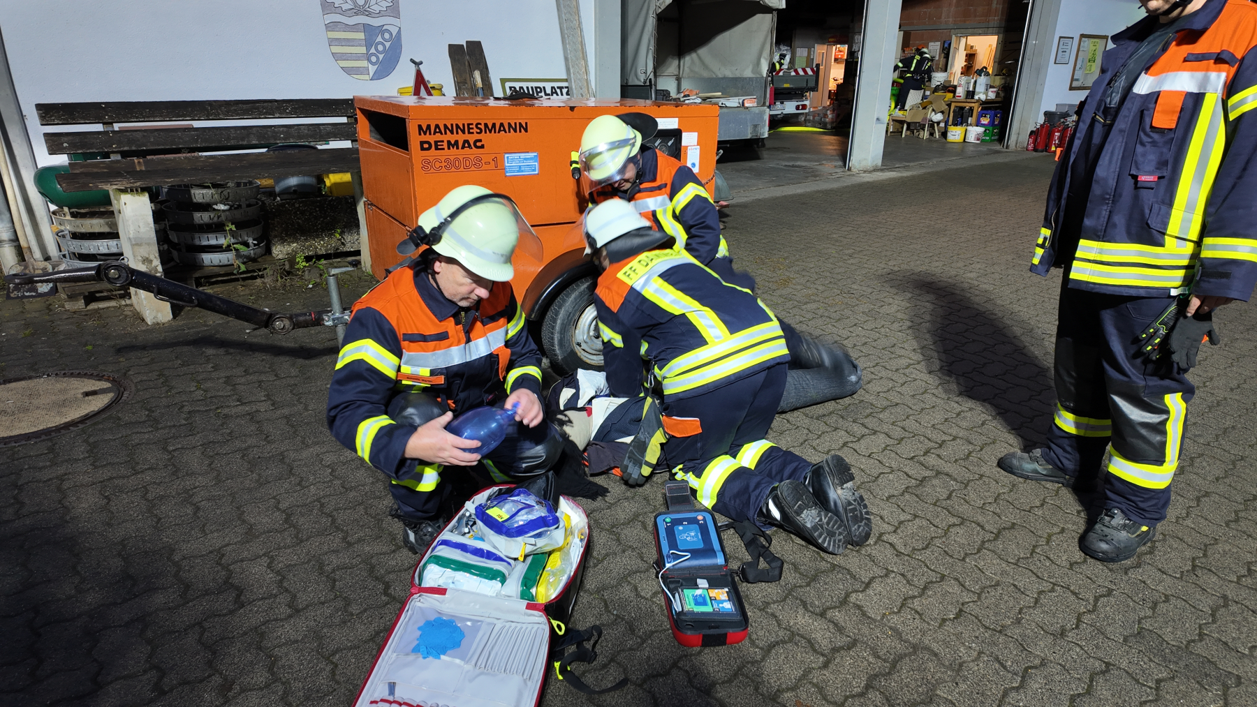 Nach der Begrüßung durch unseren Kommandanten Benjamin fuhren wir zum Gemeindebauhof. Dort wurde eine vermisste Person angenommen. Bei der Übung wurde nach der ersten Erkundung der Angriffstrupp zur Personensuche ins Gebäude geschickt. Gleichzeitig wurde im Außenbereich eine Wasserversorgung aufgebaut.