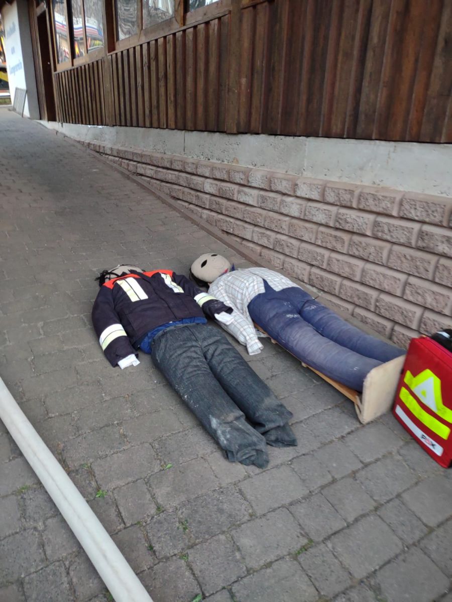 Die Anfahrt mit HLF, TLF sowie MZF als Einsatzleitung erfolgte über die darüberliegende Straße „Langenrain“. Der Gruppenführer des HLF übernahm die Erkundung des Gebäudes. Sofort entdeckte er eine Person am offenen Fenster im Obergeschoss. Diese konnte mittels Steckleiter aus dem 1OG gerettet werden . Die weitere Erkundung ergab eine Rauchentwicklung im Kellergeschoss. Rasch wurde eine Wasserversorgung aufgebaut und ein Angriffstrupp unter PA zur Erkundung ins Gebäude geschickt. Schnell konnte der Brand im Heizölraum lokalisiert werden. Da noch unklar war, ob sich noch weitere Personen im Gebäude befinden, erkundete der Angriffstrupp weiter das Gebäude. Im Übungsverlauf konnten 2 Personen im stark verrauchten Übungsobjekt gefunden und nach draußen gebracht werden. Anschließend wurde der Brandherd abgelöscht. @RH
