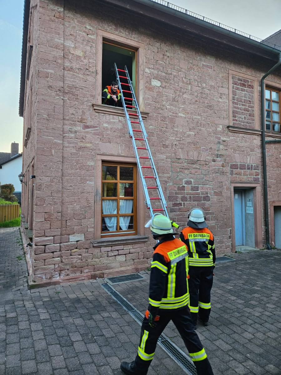 Die Anfahrt mit HLF, TLF sowie MZF als Einsatzleitung erfolgte über die darüberliegende Straße „Langenrain“. Der Gruppenführer des HLF übernahm die Erkundung des Gebäudes. Sofort entdeckte er eine Person am offenen Fenster im Obergeschoss. Diese konnte mittels Steckleiter aus dem 1OG gerettet werden . Die weitere Erkundung ergab eine Rauchentwicklung im Kellergeschoss. Rasch wurde eine Wasserversorgung aufgebaut und ein Angriffstrupp unter PA zur Erkundung ins Gebäude geschickt. Schnell konnte der Brand im Heizölraum lokalisiert werden. Da noch unklar war, ob sich noch weitere Personen im Gebäude befinden, erkundete der Angriffstrupp weiter das Gebäude. Im Übungsverlauf konnten 2 Personen im stark verrauchten Übungsobjekt gefunden und nach draußen gebracht werden. Anschließend wurde der Brandherd abgelöscht. @RH