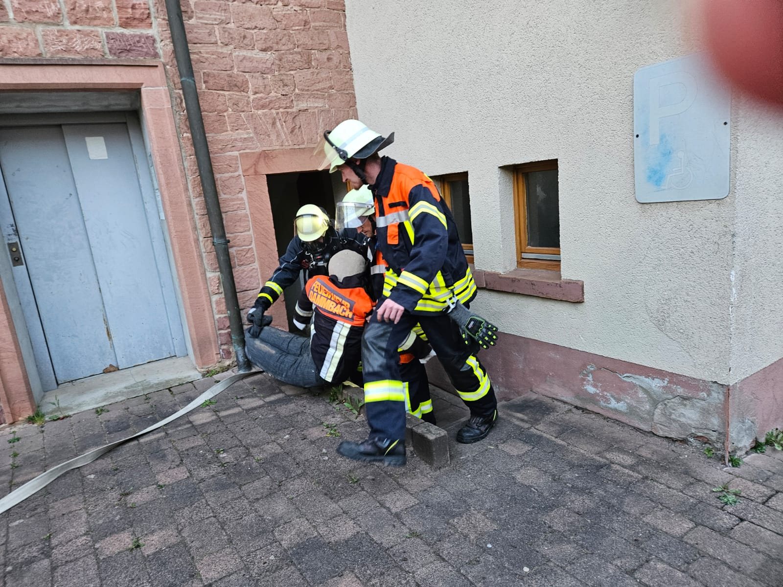 Die Anfahrt mit HLF, TLF sowie MZF als Einsatzleitung erfolgte über die darüberliegende Straße „Langenrain“. Der Gruppenführer des HLF übernahm die Erkundung des Gebäudes. Sofort entdeckte er eine Person am offenen Fenster im Obergeschoss. Diese konnte mittels Steckleiter aus dem 1OG gerettet werden . Die weitere Erkundung ergab eine Rauchentwicklung im Kellergeschoss. Rasch wurde eine Wasserversorgung aufgebaut und ein Angriffstrupp unter PA zur Erkundung ins Gebäude geschickt. Schnell konnte der Brand im Heizölraum lokalisiert werden. Da noch unklar war, ob sich noch weitere Personen im Gebäude befinden, erkundete der Angriffstrupp weiter das Gebäude. Im Übungsverlauf konnten 2 Personen im stark verrauchten Übungsobjekt gefunden und nach draußen gebracht werden. Anschließend wurde der Brandherd abgelöscht. @RH
