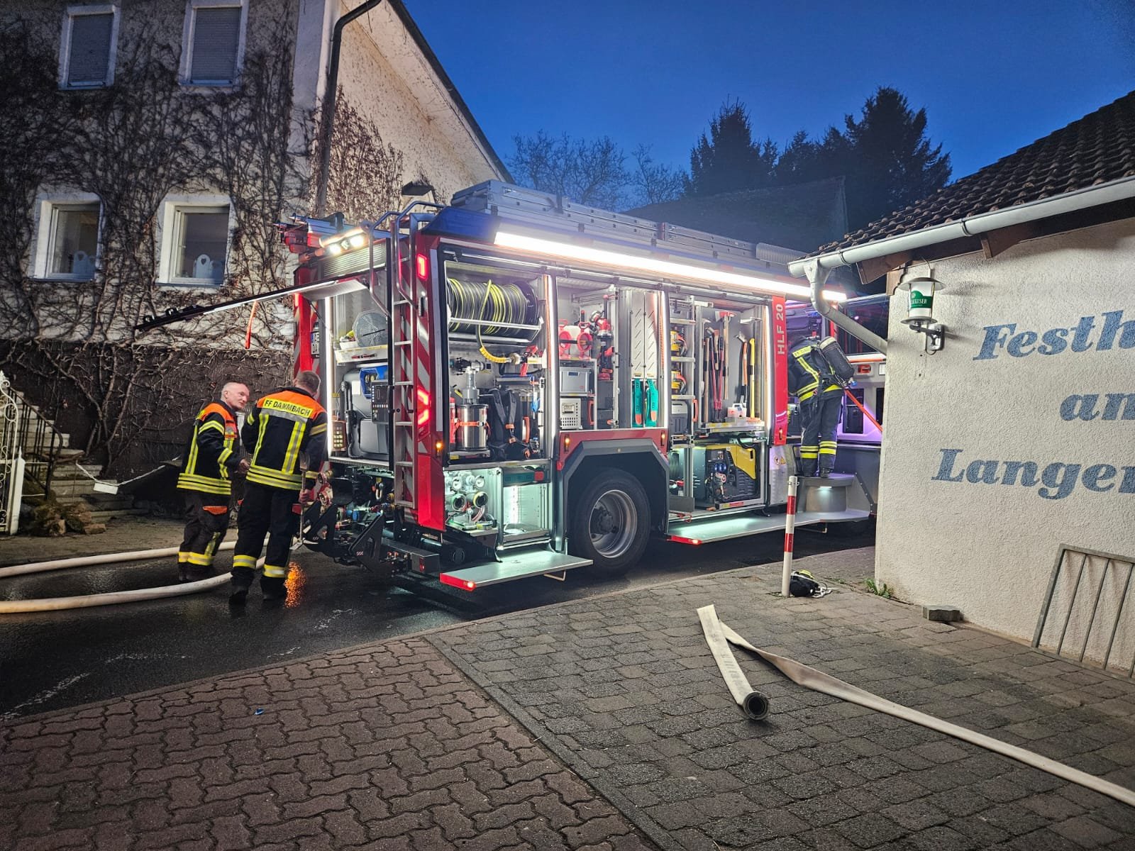 Die Anfahrt mit HLF, TLF sowie MZF als Einsatzleitung erfolgte über die darüberliegende Straße „Langenrain“. Der Gruppenführer des HLF übernahm die Erkundung des Gebäudes. Sofort entdeckte er eine Person am offenen Fenster im Obergeschoss. Diese konnte mittels Steckleiter aus dem 1OG gerettet werden . Die weitere Erkundung ergab eine Rauchentwicklung im Kellergeschoss. Rasch wurde eine Wasserversorgung aufgebaut und ein Angriffstrupp unter PA zur Erkundung ins Gebäude geschickt. Schnell konnte der Brand im Heizölraum lokalisiert werden. Da noch unklar war, ob sich noch weitere Personen im Gebäude befinden, erkundete der Angriffstrupp weiter das Gebäude. Im Übungsverlauf konnten 2 Personen im stark verrauchten Übungsobjekt gefunden und nach draußen gebracht werden. Anschließend wurde der Brandherd abgelöscht. @RH