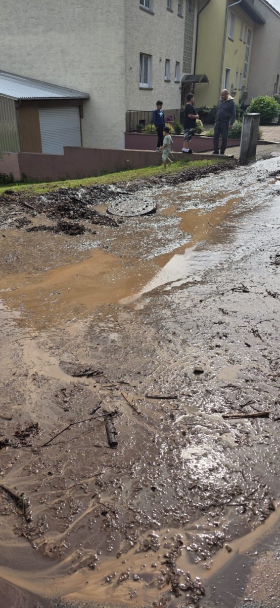 Durch Starkregen kam es aus einem Waldstück zu einem Erdrutsch hier wurde die Ortsdurchfahrt mit Schlamm und Geröll bedeckt. Mit Radlader Manpower und Schläuchen wurde die Fahrbahn gereinigt.