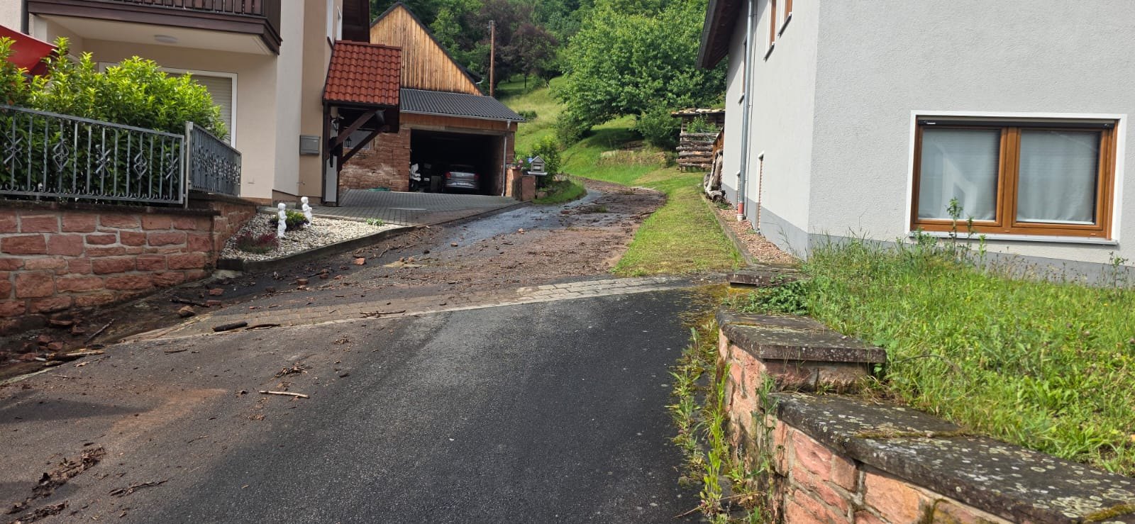 Durch Starkregen kam es aus einem Waldstück zu einem Erdrutsch hier wurde die Ortsdurchfahrt mit Schlamm und Geröll bedeckt. Mit Radlader Manpower und Schläuchen wurde die Fahrbahn gereinigt.