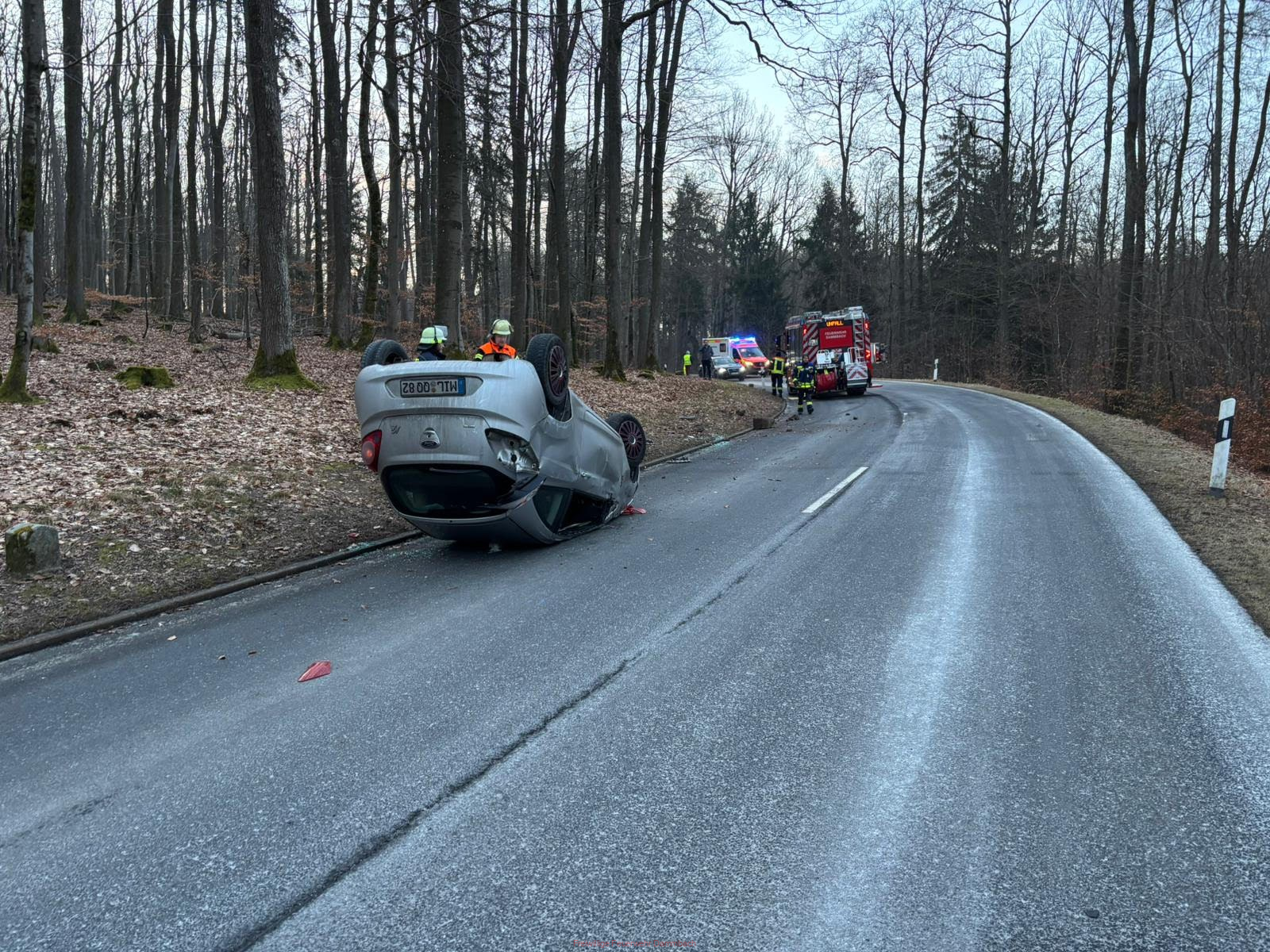 Vermutlich aufgrund von Wildwechsel verlor der Fahrer eines PKW in einer Kurve die Kontrolle über sein Fahrzeug. Das Fahrzeug überschlug sich und kam schließlich auf dem Dach liegend zum Stillstand.